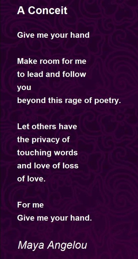 In A Conceit, Maya Angelou explores the longing for closeness and understanding beyond the realm of poetic expression. The poem contrasts the public nature of words with the private ache of love and loss, asking not for admiration but for a hand—one to lead, to follow, and to hold. With her signature grace, Angelou transforms a simple gesture into a profound symbol of intimacy, vulnerability, and human need. This piece invites readers to reflect on the quiet spaces between lines, where true connection lives.