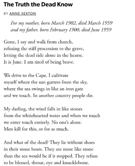 Anne Sexton’s poem The Truth the Dead Know is a raw and intimate meditation on loss, written in the wake of her parents’ deaths. Rejecting ceremonial mourning, the speaker seeks solace in nature and quiet connection. Through imagery of Cape Cod’s landscape and the metaphor of “stone boats,” Sexton explores the emotional weight of grief, the silence of the dead, and the aching solitude of the living. This powerful elegy invites readers to confront the truth that death brings—not just absence, but a transformation of how we touch, feel, and remember.